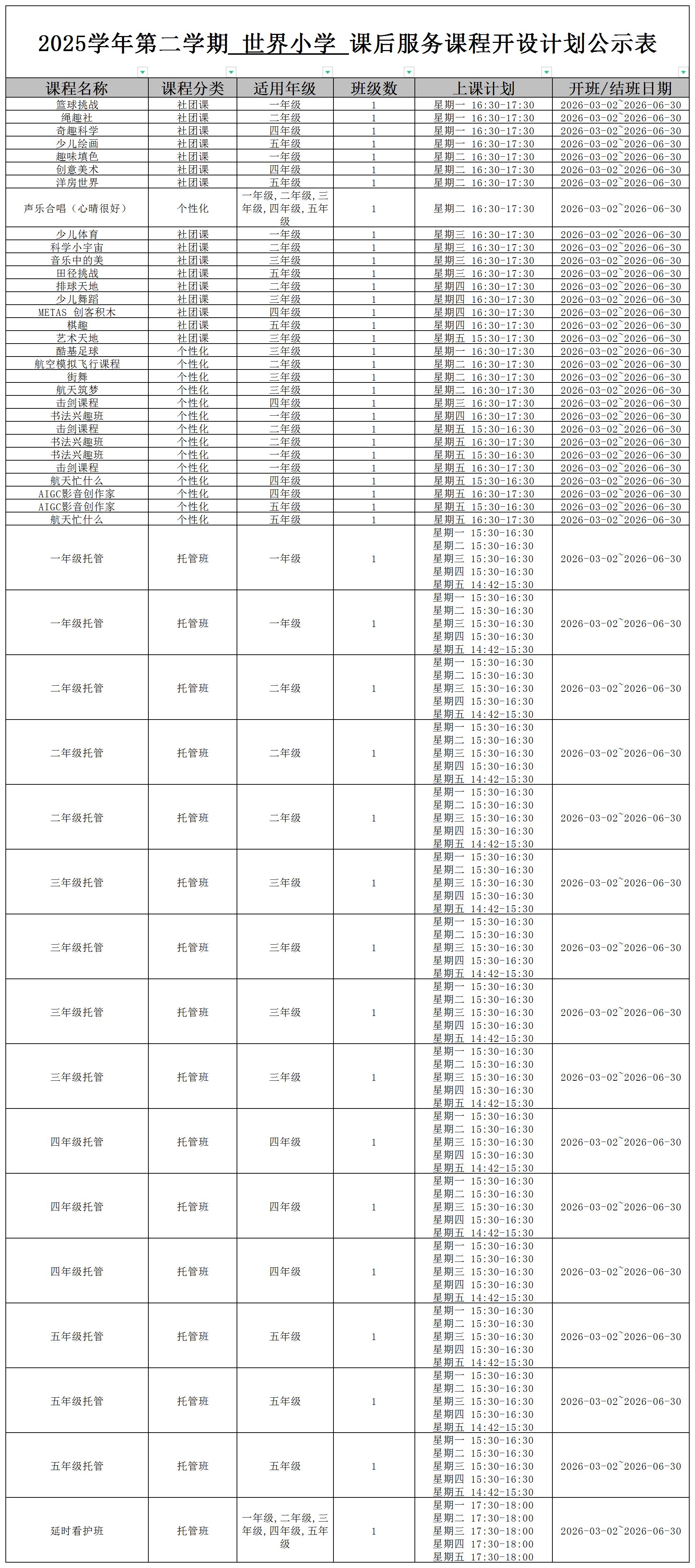 2025学年第二学期 上海市徐汇区世界小学 课后服务课程开设计划公示表